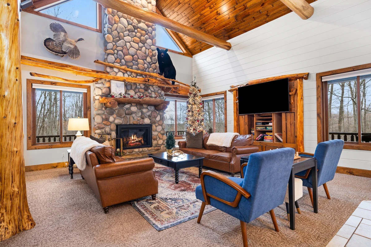 Set on 13 wooded acres, the lodge offers privacy, quiet surroundings, and space for kids to explore while adults unwind. Inside, warm wood finishes, stone details, and open living areas create a comfortable setting for shared meals, game nights, and unhurried mornings.